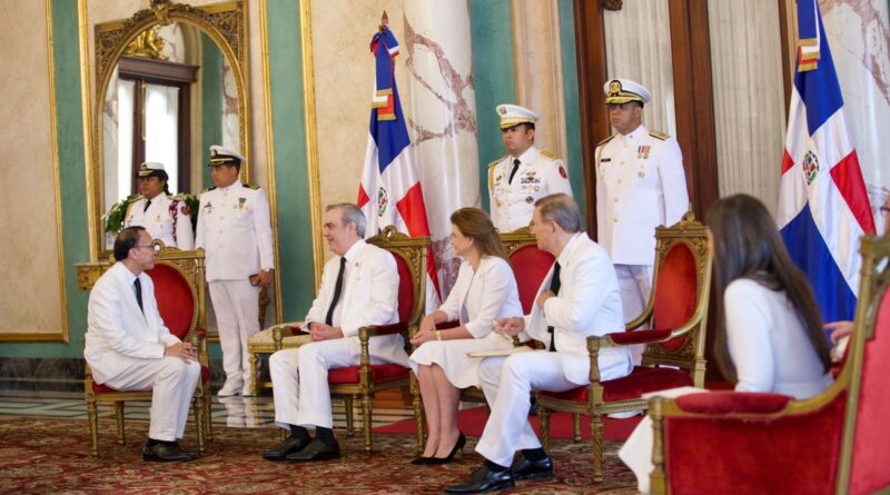 En una ceremonia solemne en el Palacio Nacional, el mandatario, junto a la vicepresidenta, Raquel Peña, y al ministro de Relaciones Exteriores, Roberto Álvarez, recibió a los diplomáticos que presentaron sus credenciales ante el Estado dominicano.
